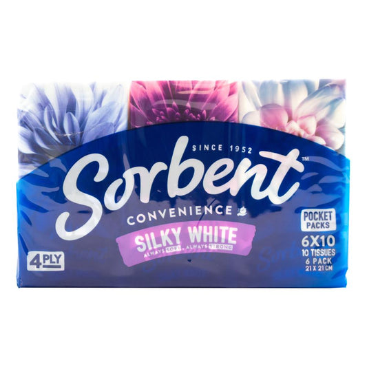 Sorbent 10 Tissues Silky White Soft & Strong Pocket Packet (21cm X 21cm) 12 x 6Pk (72 Pack)