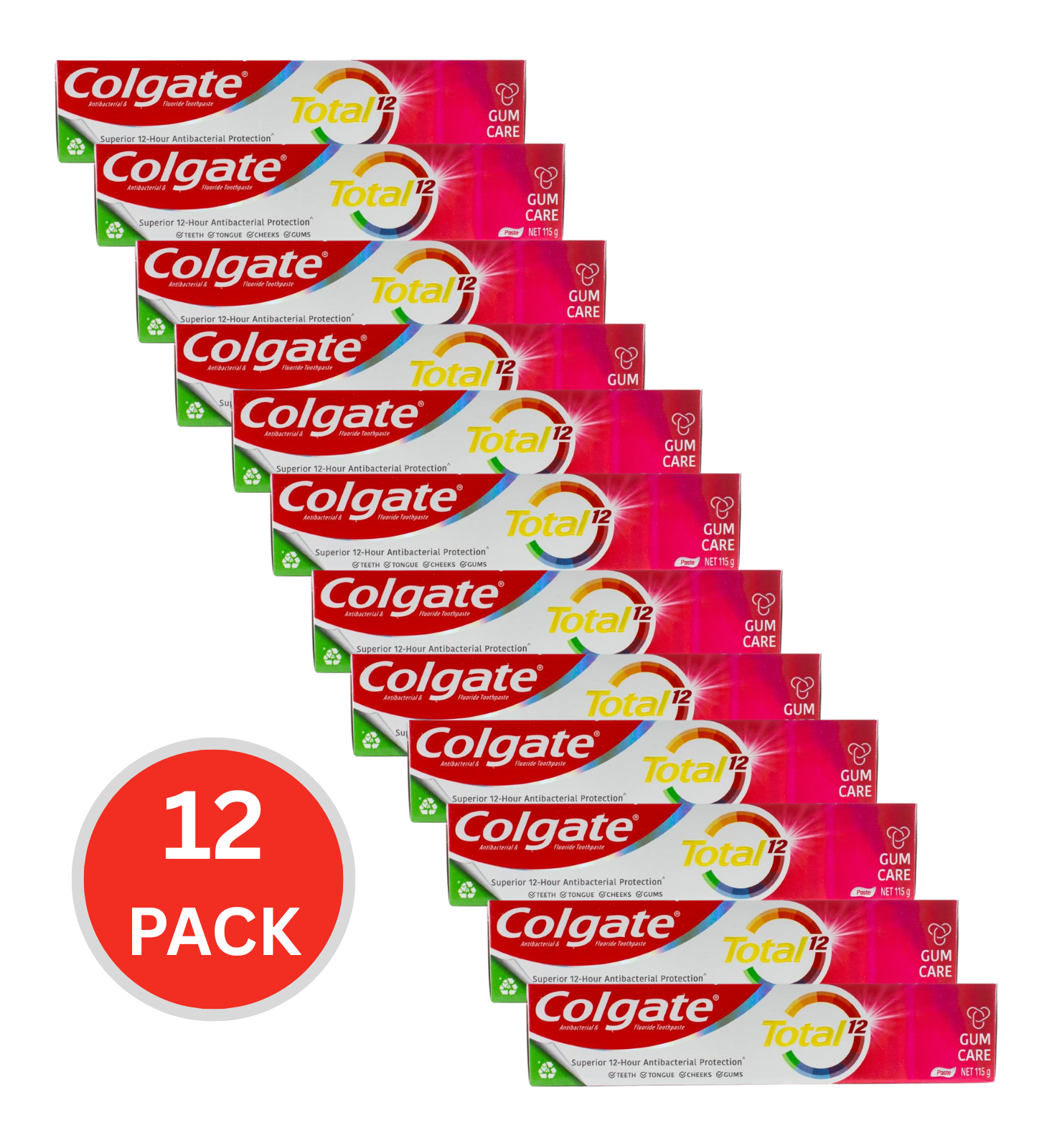 12x Colgate Total 12 Gum Care Toothpaste 115g – Advanced Protection for Healthier Gums Protect your gums and maintain complete oral health with this 12-pack of Colgate Total 12 Gum Care Toothpastes. Specially formulated to target gum problems, this toothpaste provides up to 12 hours of antibacterial protection, helping reduce gum inflammation, bleeding, and plaque buildup.