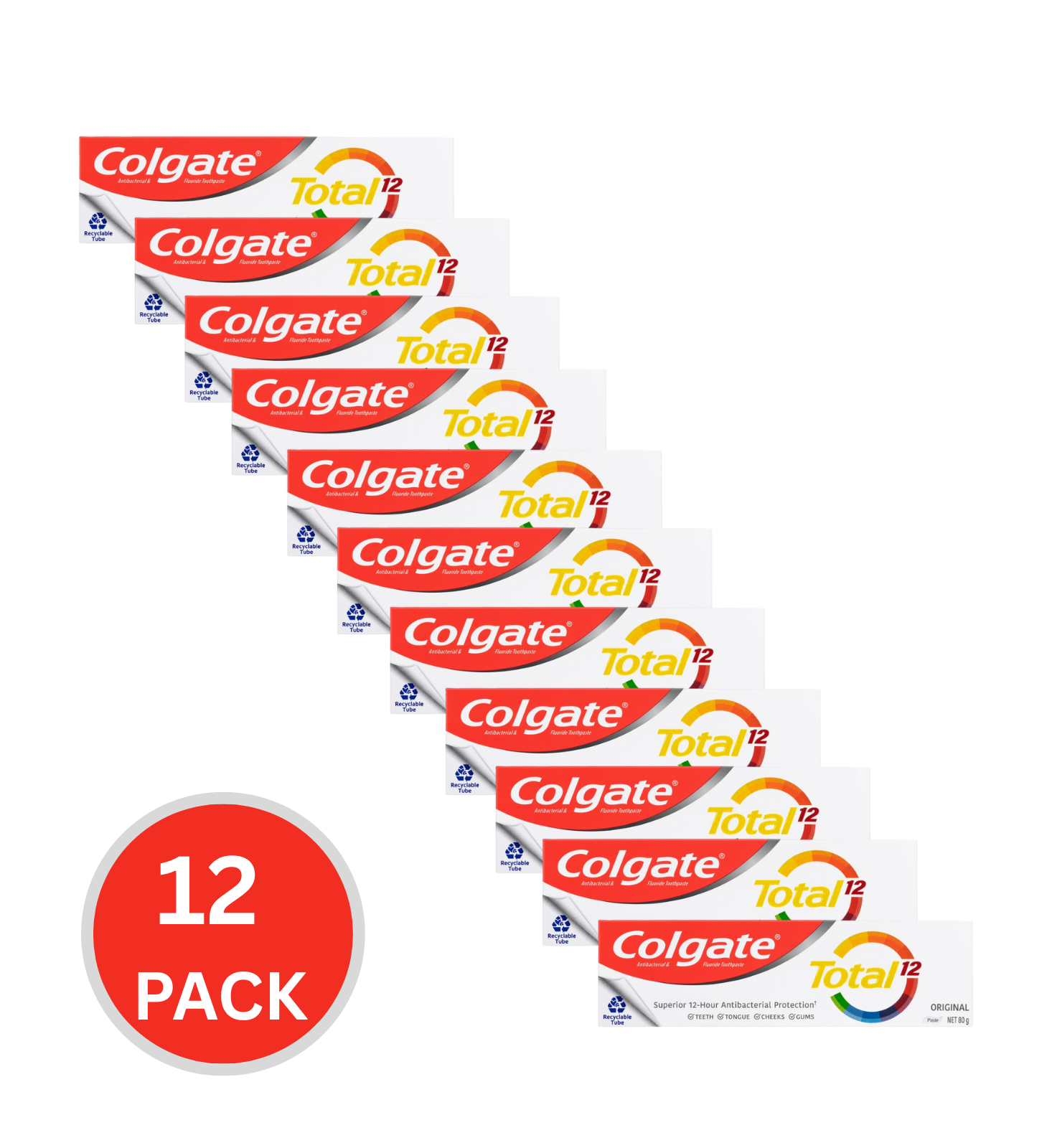 12x Colgate Total Original Toothpaste 80g – Complete 12-Hour Protection for a Healthier Mouth Keep your mouth clean and protected with this 12-pack of Colgate Total Original Toothpaste (80g each). This trusted formula offers 12-hour antibacterial protection, helping fight plaque, cavities, gum problems, and bad breath while leaving your mouth feeling fresh and healthy all day.