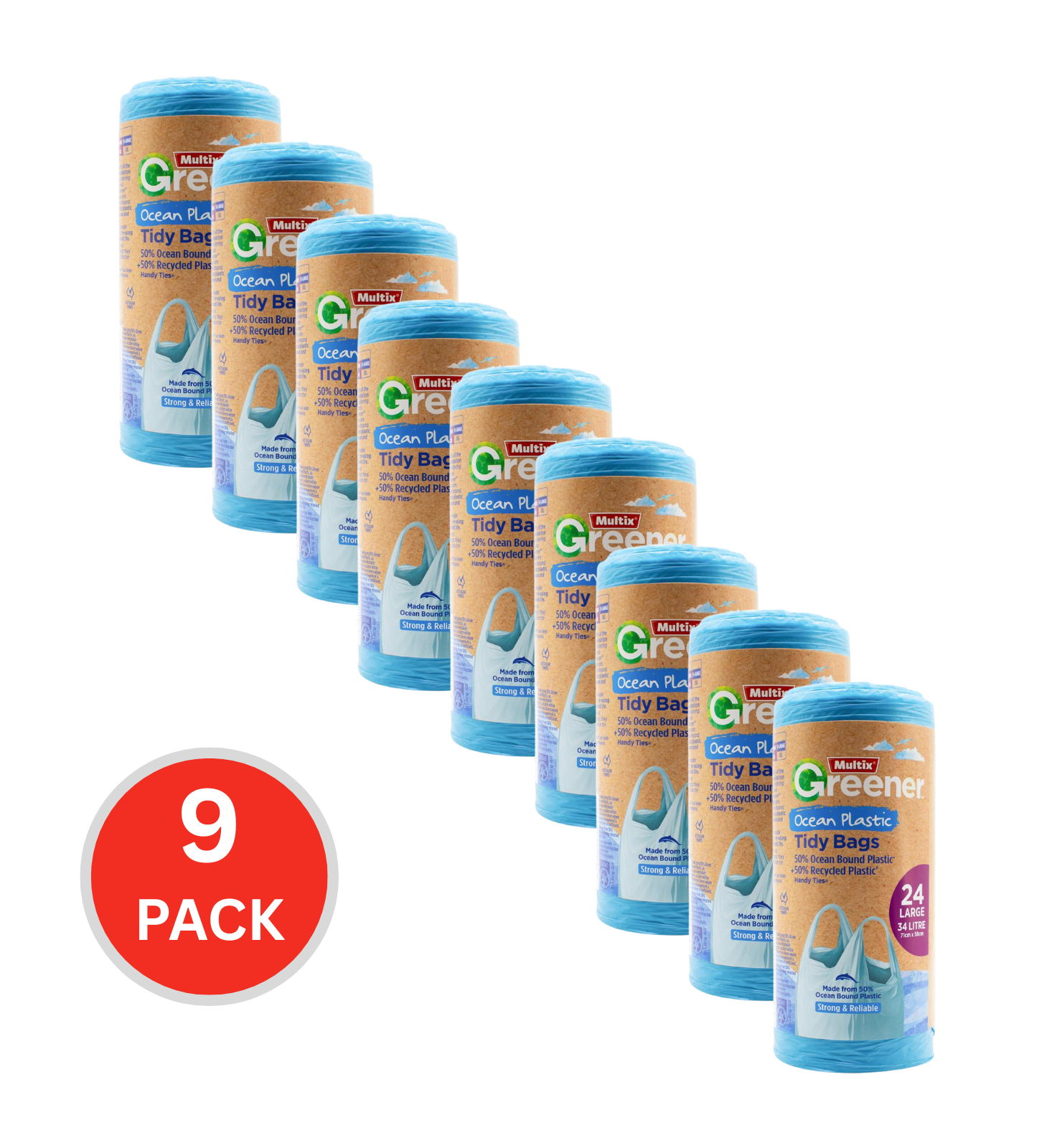 Choose a cleaner planet with this 9-pack of Multix Greener Tidy Bags, each containing 24 large (34L) bags made using ocean-bound plastic. Designed to be strong and reliable, these eco-conscious tidy bags help reduce plastic waste in the environment while offering practical household use with a spacious 34L capacity.