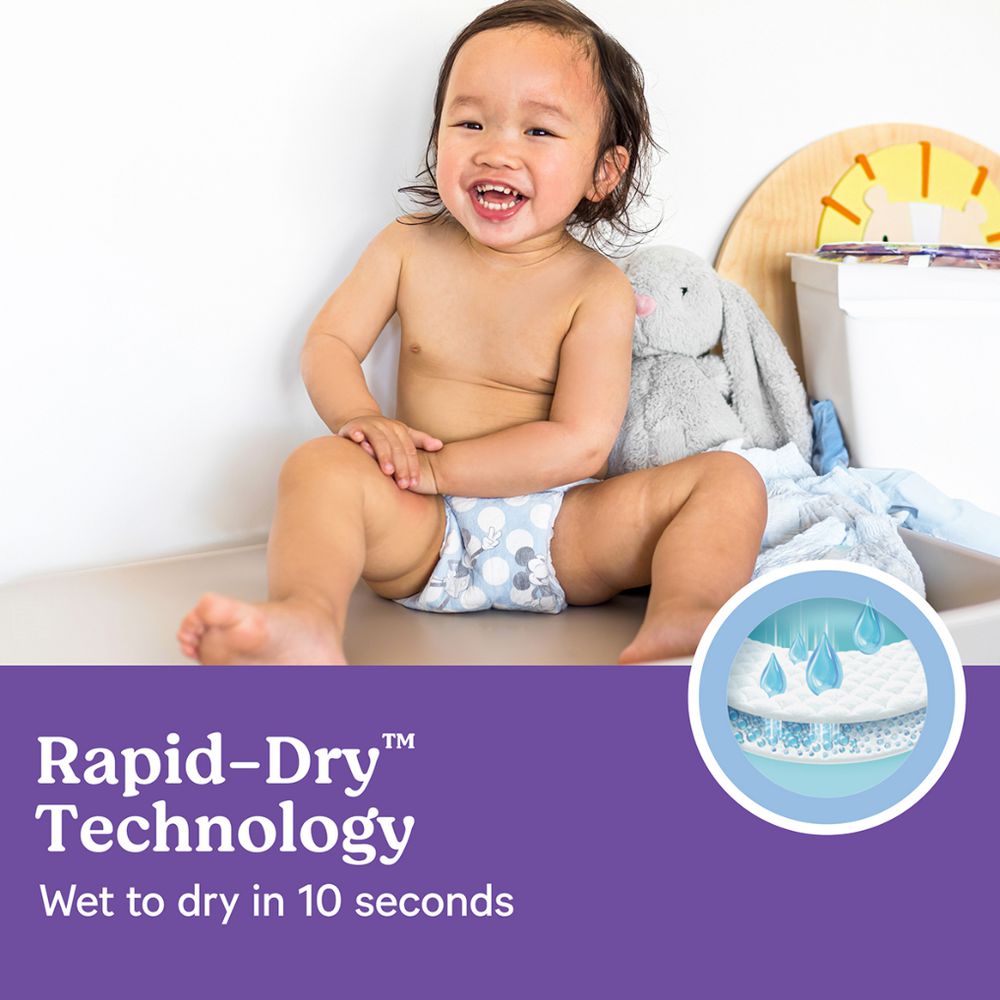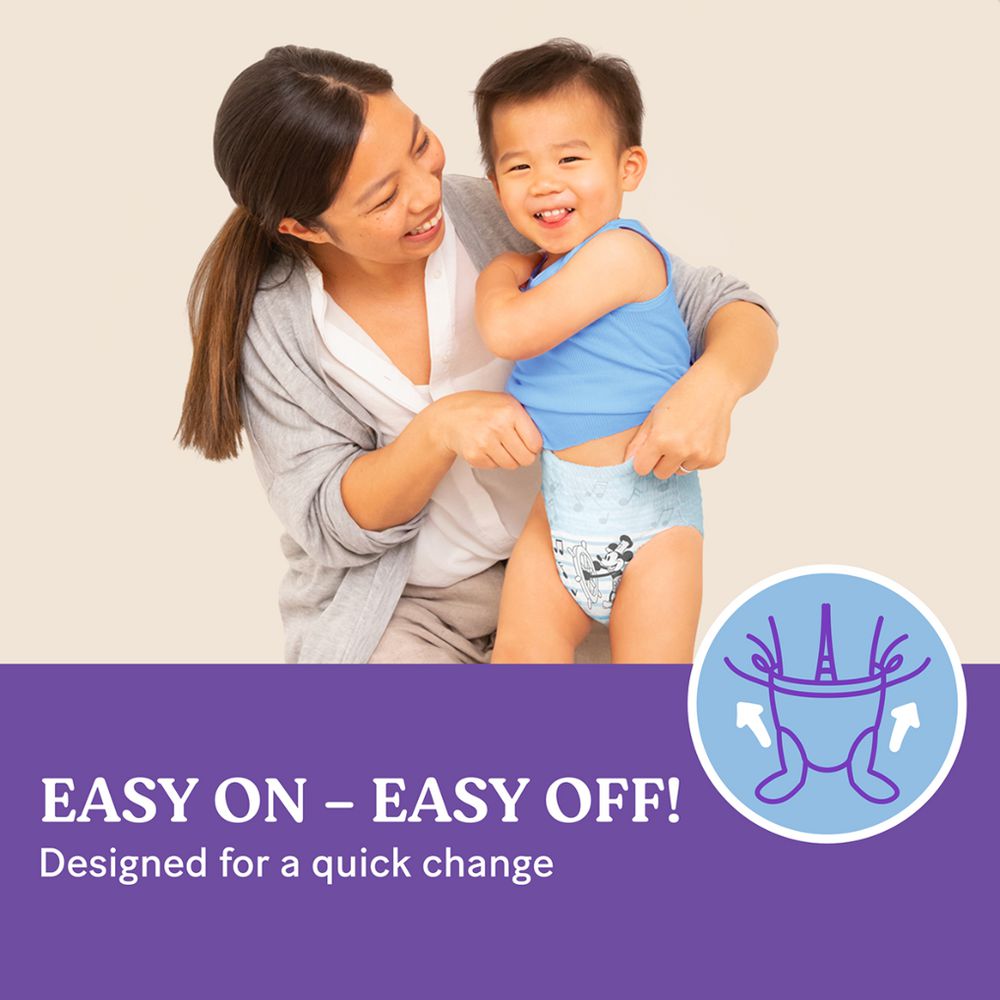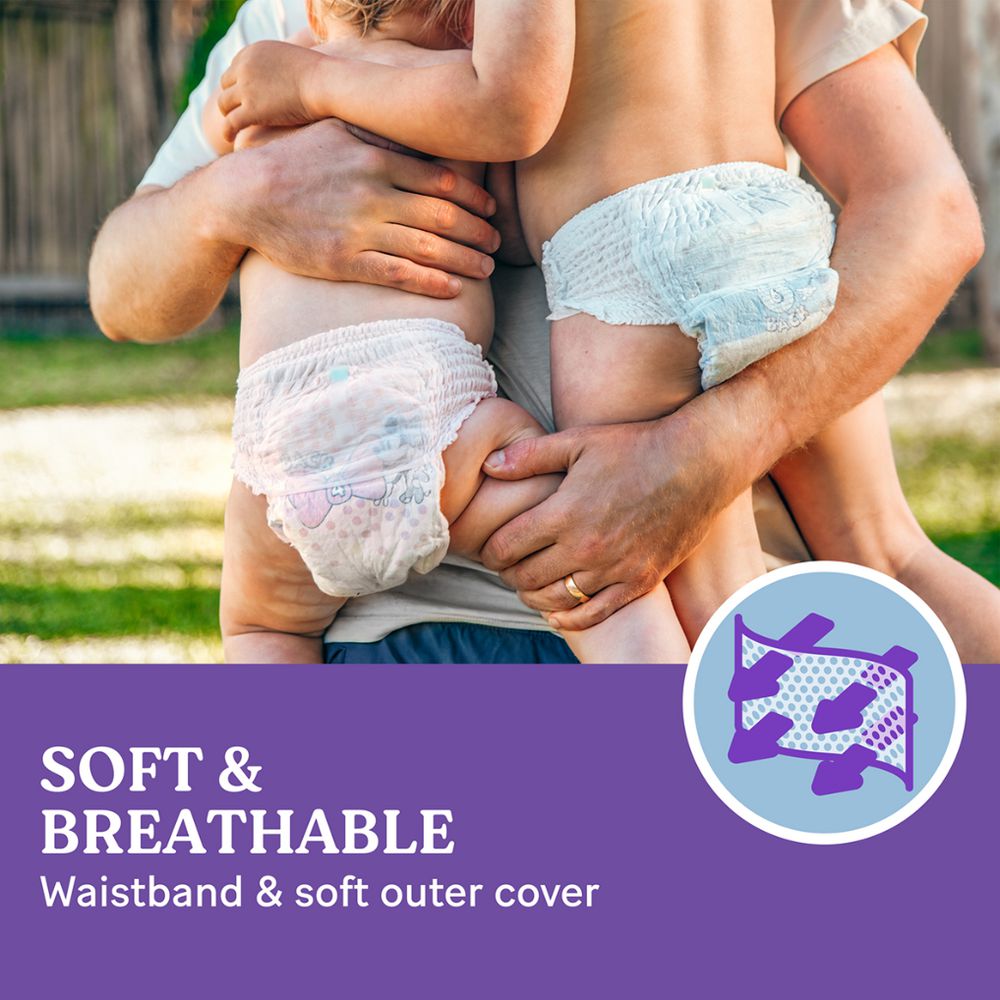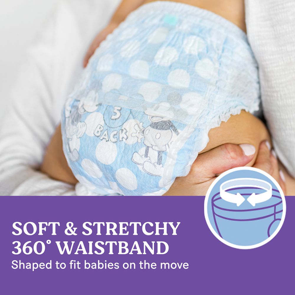 Designed for boys, these Ultra Dry Nappy Pants provide targeted absorbency in the front, giving your child the protection they need as they begin to move, explore, and crawl. The soft 360° stretchy waistband makes change time quick and easy — simply pull on and tear off the sides for removal.