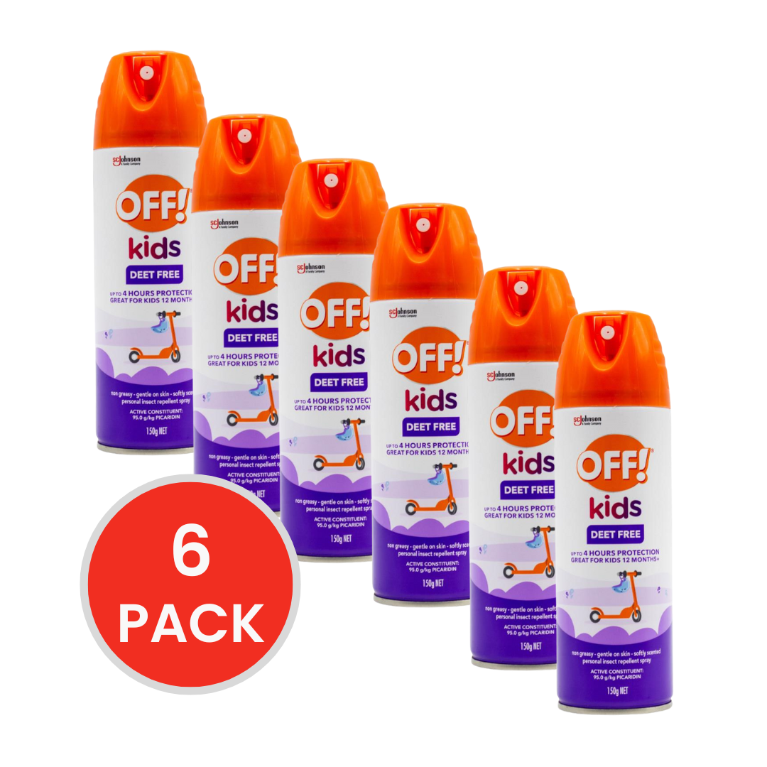 Protect your little ones with confidence using OFF!® Kids Insect Repellent Spray. Specially formulated for children, this gentle, DEET-free spray provides safe and effective protection against mosquitoes and other biting insects. With a mild, pleasant scent and skin-friendly formula, it's perfect for daily outdoor use, playtime, or vacations. The convenient 150g spray can and 6-pack value make it ideal for families who love the outdoors.